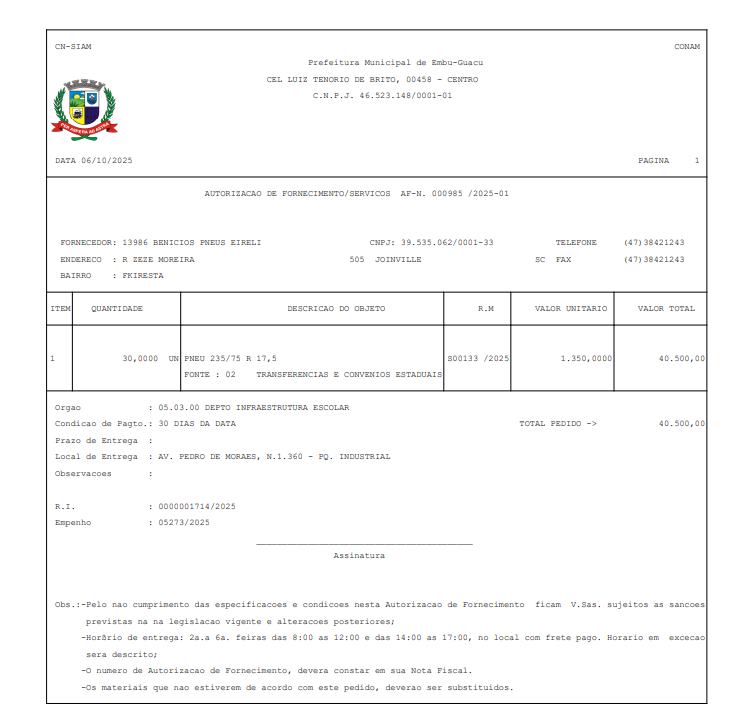 De acordo com a Autorização de Fornecimento nº 000985/2025, emitida em 06 de outubro de 2025, o município adquiriu 30 pneus na medida 235/75 R 17,5, ao custo unitário de R$ 1.350,00, totalizando R$ 40.500,00 em recursos públicos.